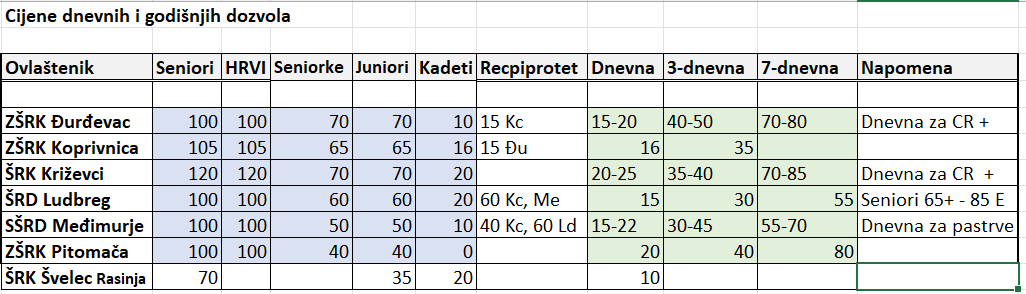 S obzirom da su obvezni upoznati ribiče putem svoje mrežne stranice. (Facebook ili web) za 2026. godinu podaci o cijenama dozvola su lako dostupni te su na ovoj stranici objedinjeni na jednom mjestu radi lakšeg odabira ribičima koji ne znaju gdje bi bili članovi ili išli u ribolov s dnevnim dozvolama. Od 2021. godine uvedene su i nove vrste dozvola, jednodnevne i sedmodnevne. Dozvola vrijedi za datum za koji je kupljena i vrijedi od 00:00 do 24:00 tog datuma. Cijena dnevnih dozvola navedena od-do odnosi se na CR vode ili vode u posebnom režimu ribolova. (ribolov pastrva).
