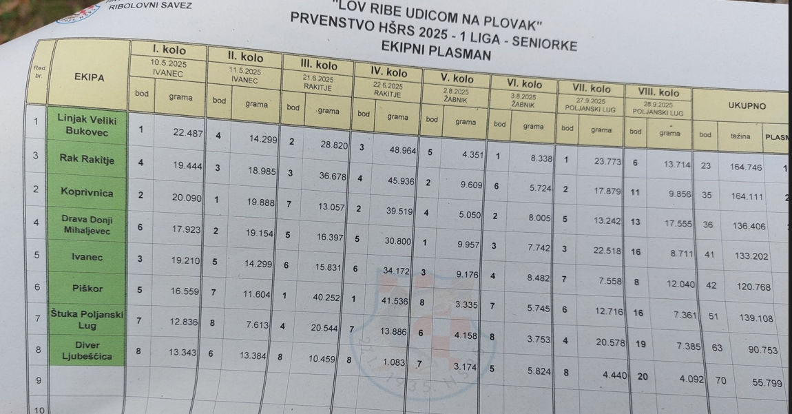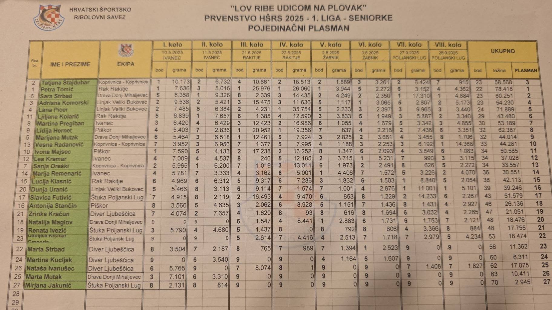 Posljednja dva koa lige seniorki održane su na stazi Poljanski lug. Ekipa Linjaka iz Velikog Bukovca uvjerljivo je naslov prvakinja Hrvatske u sportskom ribolovu s ostvarenih 23 negativna boda. Drugo mjesto osvojila je ekipa Rak Rakitje s 35 bodova i treče Koprivnica s 36 bodova. Pojedinačno najbolja je bila Petra Tomić iz Raka Rakitje ispred Sare Strbad Drava D. Mihaljevac dok je treče mjesto osvojila Tatjana Štajduhar iz Koprivnice.